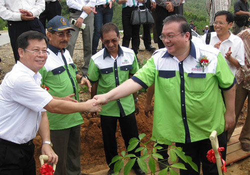 赖诗仁董事长(左)、黄国忠总经理(右)共同种植橡胶树并亲切握手