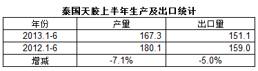 因上半年原料价格偏低,加之开割期略晚,年初以来泰国天胶产区供应量不如预期,较去年同期小幅下降。根据泰国橡胶研究组织的数字显示,1-6月泰国天胶产量167.3万吨,较去年同期减少12.7万吨,同比下降7.1%。受产量下降影响,上半年泰国天然橡胶出口量也略有缩减,1-6月整体出口为151.1万吨,较去年同期下降7.9万吨,同比减5%。