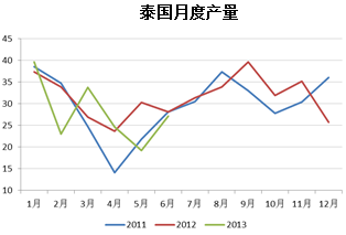 随着近期天气的稳定,泰国生产已趋稳定。预计2013年全年泰国天胶产量为386.4万吨,较12年增加8.6万吨或2.3%。而从中长期来看,05-08年间泰国大量种植和翻新的胶园将逐步进入开割期,产量也将稳步增加,预计2020年泰国天胶产量将继续稳定增长,预计至2020年产量将增产至430万吨以上。