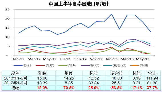 复合胶成为上半年供应的亮点。1-6月复合胶产量为37万吨,占整个产量的比重提高至22.1%,而去年上述比重为18.3%。复合胶的大量增产,也是源于中国需求的激增。1-6月中国共进口了80.15万吨复合胶,较去年同期增43.8%;其中来自泰国的复合胶达到40万吨,较去年同期增加56.8%。复合胶一部分分流了标胶的产量,上半年泰国标胶产量为150.6万吨,较去年同期稳中有降。