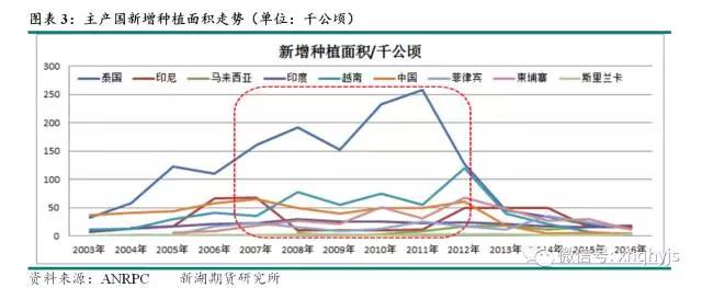 天然橡胶自种植至开割需年,主产国在2007-2012 年间较大的新种及翻种面积,2014-2019 年新增割胶面积将大幅增加,2017 年以后青壮年的胶树增量较为明显,理论供应放量也将十分明显。