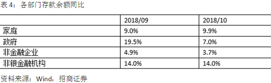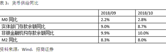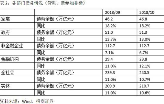 - 我们拆解的数据显示,考虑非标后,10月实体部门债务余额同比增速连续第二个月下行,数据证伪此前有关政策转向放松的预期。我们维持此前对于政策的判断:“目前来看,我们认为中央的目标非常明确,一是坚定去杠杆(实体部门债务余额同比增速下行)的方向;二是稳定宏观杠杆率(实体部门债务余额与名义GDP之比基本稳定)。在名义GDP增速下行背景下,去杠杆和稳定宏观杠杆率并不矛盾,按照现有数据估算,去杠杆将持续到2019年年中附近。” - 金融机构债务余额同比增速方面,10月有所反弹;不过,在我们观察的广义金融机构债务规模中该数据占比约三成,还需关注后续广义金融机构债务数据。一方面,需要关注广义金融机构债务余额同比增速是否会跌破今年1月的历史低点,若如此,我们有关金融去杠杆基本结束的判断可能会发生改变;另一方面,也需要关注广义金融机构债务余额同比增速是否持续上升,若如此,或引发央行政策挤压。我们倾向于认为,目前广义金融该机构债务余额同比增速稳定在3%左右,是一种的合意水平。 - 目前来看,我们维持此前的判断,今年2月以来中国所处的状态是,实体部门债务余额同比增速小幅回落,而金融机构负债同比增速低位企稳。上述组合意味着,利率债面临的环境是,供给小幅下降,需求基本稳定,因此无风险收益率整体处于下行通道;而权益还难言寻底结束。短期来看,实体部门债务余额同比增速连续两个月下行,货币政策6月异常放松后的修正工作在8月底前后基本完成,由此对债市形成的短期冲击(7月下旬至9月下旬)已经结束,继续看好长久期利率债收益率下行。   - 货币供给方面,9月M2同比增长8.0%,低于前值8.3%。分结构来看,政府和非金融企业存款余额同比增速明显低于前值,虽然家庭部门存款余额同比增速高于前值,但整个实体部门存款余额同比增速低于前值;非银金融机构存款余额同比增速保持平稳。10月,政府部门存款余额同比增速明显低于前值,政府债务余额同比增速亦低于前值,合并来看,反应政府并未明显增加支出。根据现有数据估算,11月政府部门债务余额同比增速或低于10月,证明政策未转向放松和刺激杠杆增加。   - 数据显示,按照最新口径,总规模为197.9万亿的社融余额10月末同比增长10.2%,低于前值10.6%。我们测算的总规模为216.2万亿的贷款加债券余额10月末同比增长13.3%,前值13.4%;进一步加入委托贷款、信托贷款、未贴现票据三项非标融资后,10月末总债务余额为240.5万亿,同比增长10.7%,前值11.0%。 - 从结构上看,10月非金融企业贷款加债券余额同比增速低于前值,结束了此前连续10个月稳中有升的状态;如果加入信托贷款、委托贷款和未贴现票据三项非标融资,则明显低于前值,反应表外转表内的情况或仍在延续,但冲击减弱。10月家庭部门债务余额同比增速与前值基本持平,结构上看,中长期贷款低迷、短期贷款表现较为强劲,我们判断家庭部门去杠杆方向未变,对应房地产数据表现难言乐观。2017年6月至2018年4月,政府部门债务余额同比增速一直保持平稳走势,5月底跌破平台低点,7月之后的一段时间则有望在低位再次形成一个平台,政府部门整体去杠杆的方向未必,但空间进一步压缩。金融机构方面,目前我们能观察到的金融机构债务约为30万亿,占广义金融机构债务规模的近三成,因此其代表性较差,根据现有数据,我们倾向于判断10月广义金融机构债务余额同比增速略高于前值。在目前的政策背景下,我们倾向于认为,政府有意维持金融机构债务余额同比增速低位稳定,若有趋势上升,容易引发政策反弹。另一方面,也需关注广义金融机构债务余额同比增速是否会跌破今年1月的历史低点,若跌破历史低点,我们有关金融去杠杆基本结束的判断可能会发生改变。 - 货币供给方面,M2同比增速有所回落,缴准基数余额同比增速亦有下行,M0和财政存款合计环比上升,结合同业存单数据分析,10月超额备付金率或与9月基本持平;目前来看,超额备付金率或维持在2%左右,显示货币政策难言转松。10月非银金融机构存款余额同比增速与前值持平,仍在两位数,结合负债数据,显示其流动性尚保持充裕。家庭存款余额同比增速高于前值,去杠杆下持续上升概率不大;非金融企业活期存款储备明显下降,去杠杆下将处于低位;财政存款余额同比增速大幅低于前值,与政府债务余额同比增速明显回落合并考虑,财政支出并未明显增加。 - (1)10月M0同比增速反弹,实体部门存款余额同比增速下降,非银金融机构存款余额同比增速平稳。 - 10月M2同比增长8.0%,前值8.3%;M0同比上涨2.8%,前值2.2%。剔除掉M0之后,10月存款余额同比增长8.9%,前值9.1%。我们考虑计入M2的存款,10月底非银金融机构存款余额同比增长约10.0%,前值9.9%;家庭和非金融企业存款余额同比增长约8.7%,前值9.0%。 - 10月M1同比增长2.7%,前值4.0%。剔除掉M0之后,10月非金融企业活期存款余额同比增长2.7%,前值4.3%,非金融企业活期存款储备明显下降,去杠杆下将处于低位。 - 分部门来看,10月底家庭存款余额同比增长9.9%,前值9.0%;10月底非金融企业(不含机关团体)存款余额同比增长3.7%,前值4.9%;10月底政府存款余额同比增长7.0%,前值19.5%。10月底非银金融机构存款余额同比增长14.0%,前值14.0%;10月非银金融机构存款余额同比增速基本平稳,仍有两位数,结合负债数据,显示其流动性尚保持充裕。 - (2)10月实体融资继续回落,表外转