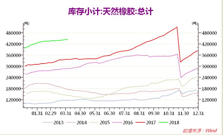 库存方面,继上周青岛保税区的天胶库存微跌之后,上期所天胶库存总量再次上涨,4月4日,上期所天胶总库存约为44.46万吨,较前值44.28万吨增长0.18万吨。