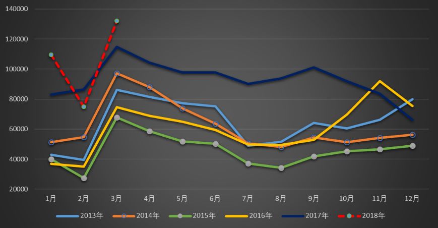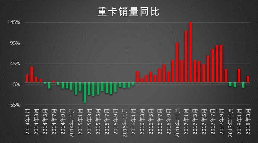 下游需求方面,据第一商用车网,2018年3月,我国重卡市场共约销售各类车型13.2万辆,比去年同期的11.46万辆增长15%。推动3月份市场同比增长的原因,主要就是固定资产投资的拉动,以及由于对市场看好所进行的库存备货。3月初开春以来,大量基建工程陆续开工,为以自卸车、搅拌车为代表的重型工程车辆带来了传统旺季的“春天”。从各地传来的销售订单中虽然以工程车为主,其中不乏牵引车,但一个不容忽视的现象便是,受2017年牵引车提前透支和运力过剩以及运费低迷的影响,牵引车3月开春以来的终端需求并不算旺,比去年同期的订单需求更是大幅下跌,这为今年下半年市场的走势埋下了隐患。