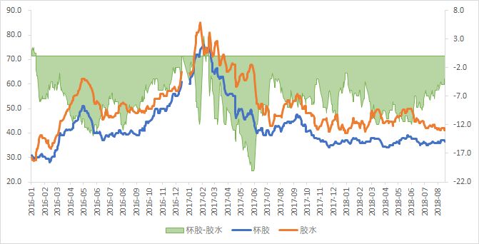 继上上周反弹之后,上周沪胶继续放量大跌。Ru1809周二到周五,从10400跌至9855,下跌4.52%。Ru1901同期从12480跌至11725,下跌6.05%。价差上,在经历周四大跌之后,Ru1809周五的收盘价格已经贴水混合胶470元/吨,按照以往的经验,当9月合约贴水现货混合胶500元时,下游开始接盘,不知道现在混合胶升水470元/吨,下游还满意么?