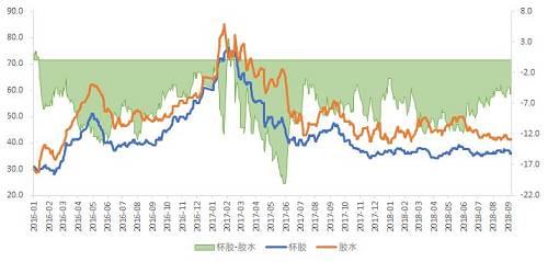 泰标混合胶10500元,升水9月合约105元,贴水1月合约1515元。按照以往经验看,9月合约贴水混合胶500元才会有下游接盘,目前的价格接受还是有点无力。而下周就要面临Ru1809交割了,非标价差能否达到合理的区间,我们拭目以待。