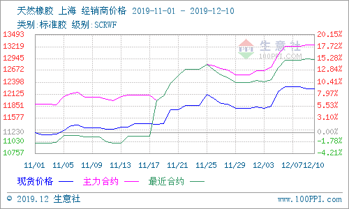弱势徘徊已有几年的天然橡胶,在2019年低价位围绕2000元/吨的区间上下已震荡大半年,6月下跌至年度最低位至今,已有五月整。胶价在下半年的五月间,不断震荡,经历了“金九银十”的传统消费旺季,加之东南亚受暴雨和真菌病的影响,产量受限,天然橡胶行情从11月开始有一定起色。11月我国云南开始步入停割期,资金此时逐步青睐天然橡胶,在下旬开始之日大幅上涨,天然橡胶终于止跌上扬,沪胶有大资金量关注,盘面强势拉高。11月底12月初几日短期回调之后,12月4日大幅大涨,合约RU2005期价单日涨幅3.57%,盘中最高13380元/吨,为年内价格新高,20号胶NR2003期价同样大幅上涨,现货随后几日跟涨,采购端观望情绪较浓,9日、10日行情稍有回调。据生意社(100ppi.com)监测数据显示,天然橡胶(海南标一)12月上旬最低价为1日的11790元/吨,最高点为6日-80日的11290元/吨,10天涨幅4.2%,天然橡胶当前仍处于较强的行情趋势中。