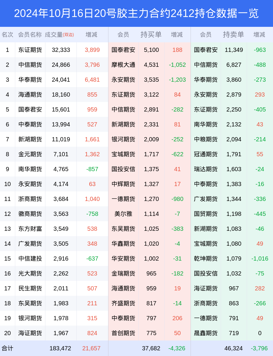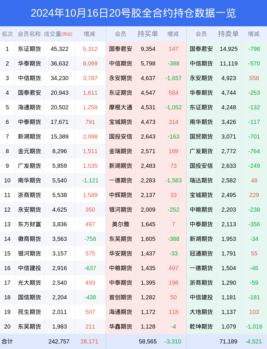 根据交易所数据,截至10月16日收盘主力合约20号胶2412,涨跌-2.34%,成交量11.80万手,持仓数据显示前20席位呈现净空,差额头寸为8642手。