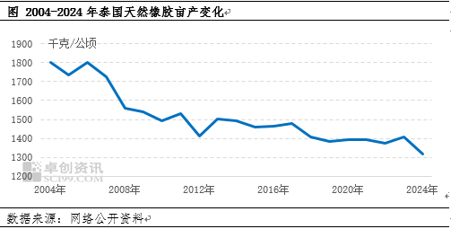 近些年,泰国天然橡胶亩产呈现出下降趋势。主要原因在于:首先,受气候影响,近年来泰国持续遭遇异常气候影响,干旱、高温以及洪水等天气频发,极端气候条件对橡胶树的生长和原料胶水产出造成一定影响。同时,落叶病、炭疽菌等侵袭也进一步加剧泰国主产区橡胶产量的下滑。其次,从种植结构来看,由于前些年橡胶经济效益低迷,导致中南部地区胶农选择砍伐老橡胶树,转而种植棕榈(7878, 112.00, 1.44%)和其他热带水果等更具经济效益的农作物。而种植结构的调整直接导致了橡胶种植面积的减少,从而影响了亩产量。此外新老胶林替代跟进的不充分以及割胶工短缺等影响天然橡胶整体产出。