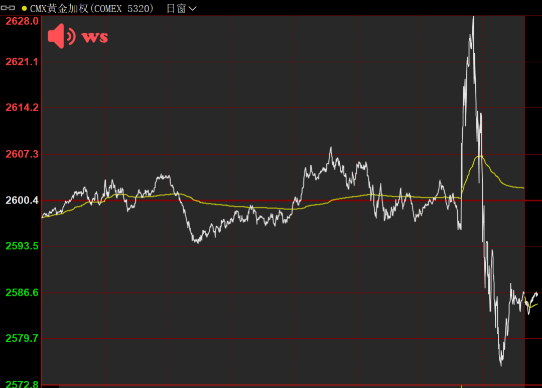决议公布前略高于2570美元/盎司的现货黄金迅速涨破2590美元/盎司,鲍威尔发布会将要开始时一度突破2600美元/盎司,刷新周一所创的盘中纪录,日内涨近1.2%,但发布会开始后持续回落,美股午盘转跌。纽约期金也在盘中涨超1%至历史新高2627.2美元/盎司后转跌。