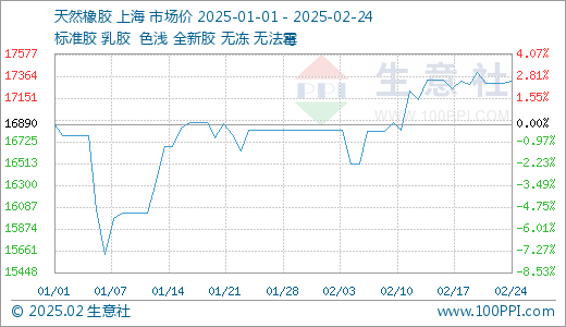 - 据生意社商品行情分析系统,近日(2.17-2.24)国内天然橡胶现货行情小幅上行,截止到2月24日我国天然橡胶市场现货胶行情在17320元/吨左右,较17的17240元/吨上涨0.46%。原料价格高位继续小幅上探;国内天胶港库库存微幅下降;节后下游开工逐步提升,加之沪胶节后行情偏强震荡,带动天然橡胶现货行情小幅上行。